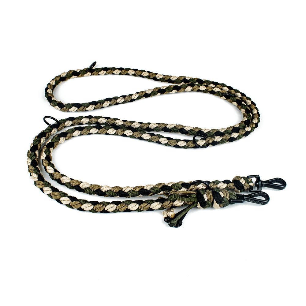 Diese Hundeleine ist aus hochwertigem Paracord gefertigt und zeichnet sich durch ein elegantes Flechtdesign in Schwarz, Weiß, Grün und Neonorange aus. Die Leine ist vollständig verstellbar, wodurch sie sich für Hunde verschiedener Größen und unterschiedliche Verwendungszwecke eignet. Die Metallelemente an beiden Enden der Leine sorgen für eine einfache und sichere Befestigung am Halsband sowie für ein bequemes Halten.