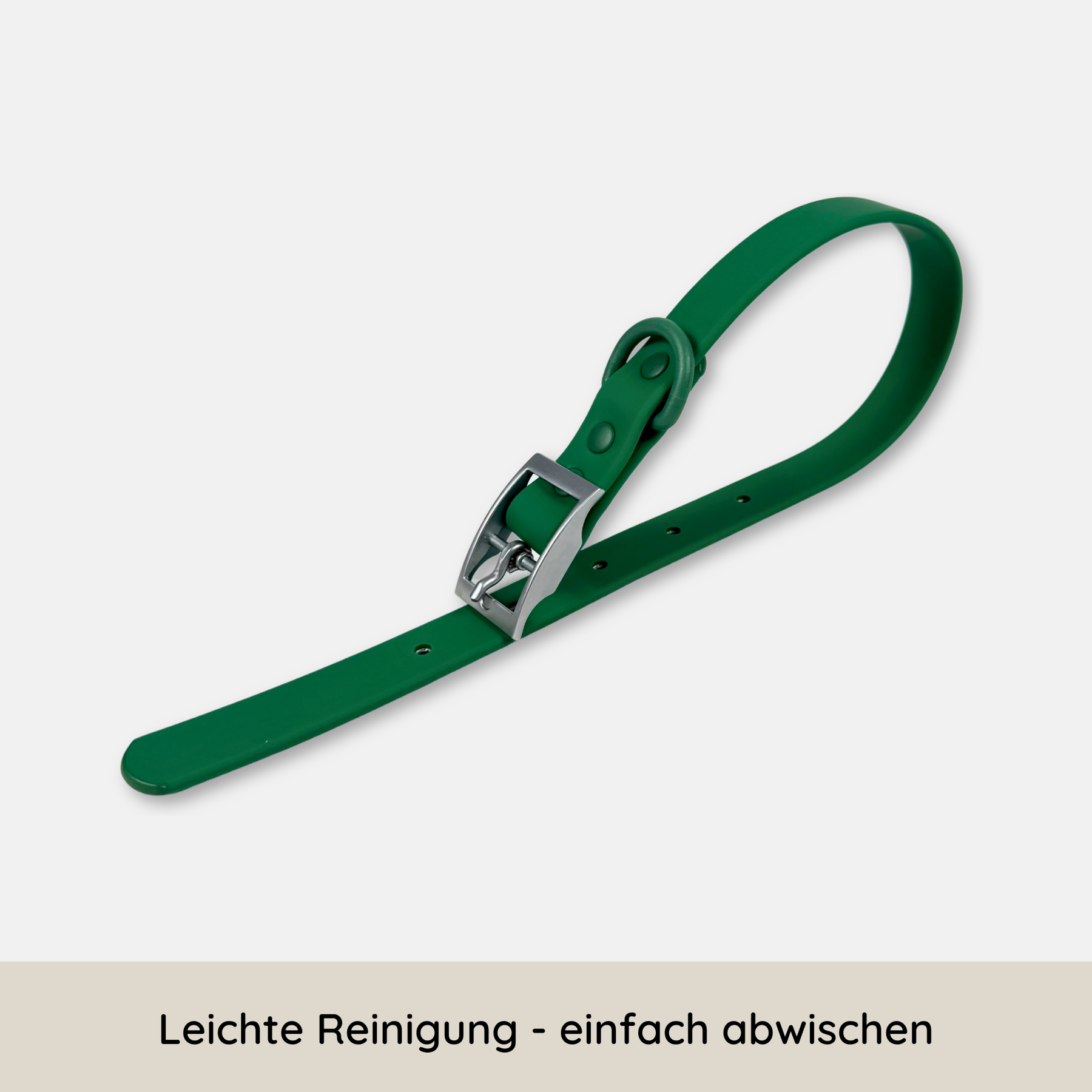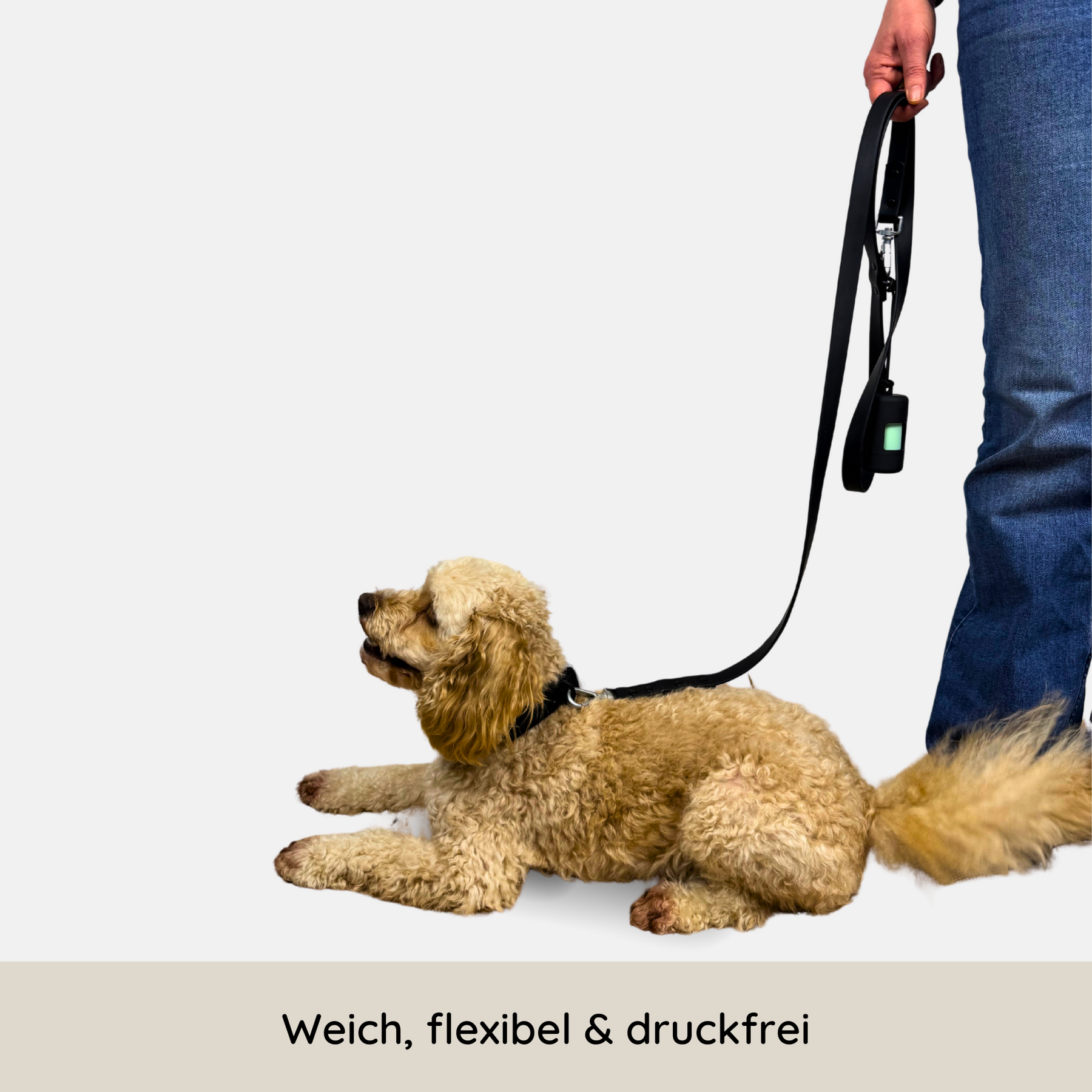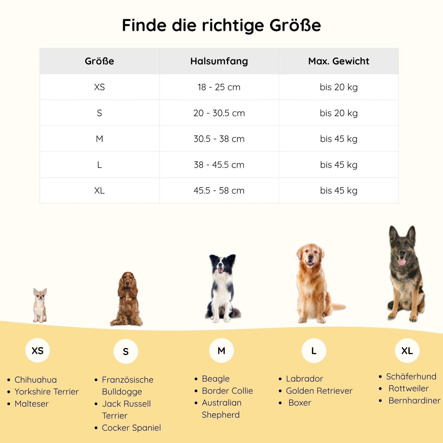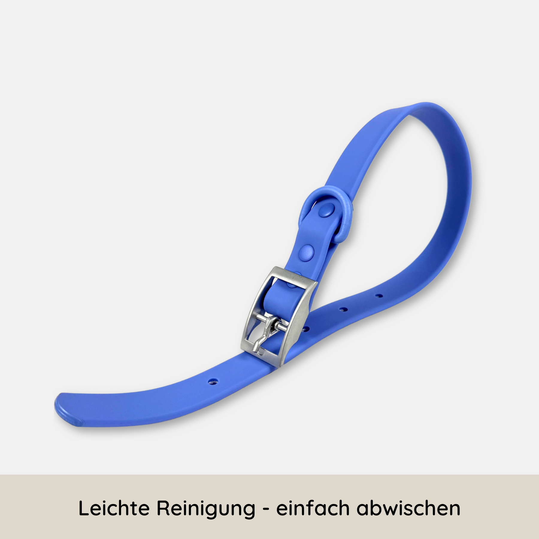 Das weiche, flexible Material mit abgerundeten Kanten liegt angenehm am Hals und verhindert Scheuern und Druckstellen, während das verstellbare Design eine perfekte Passform und Flexibilität bietet. So bleibt das Halsband auch bei wachsenden Hunden stets bequem und sicher.