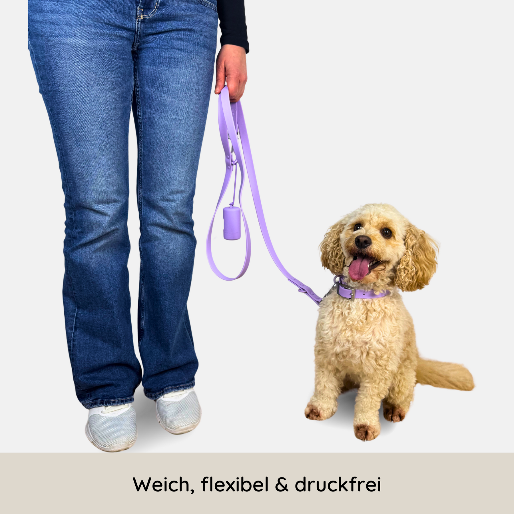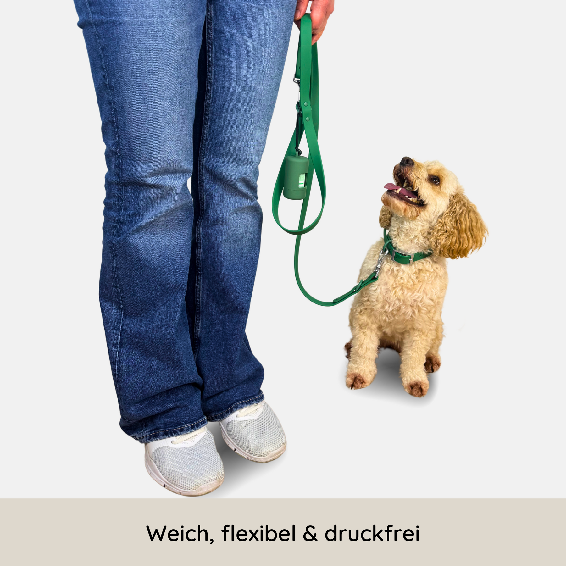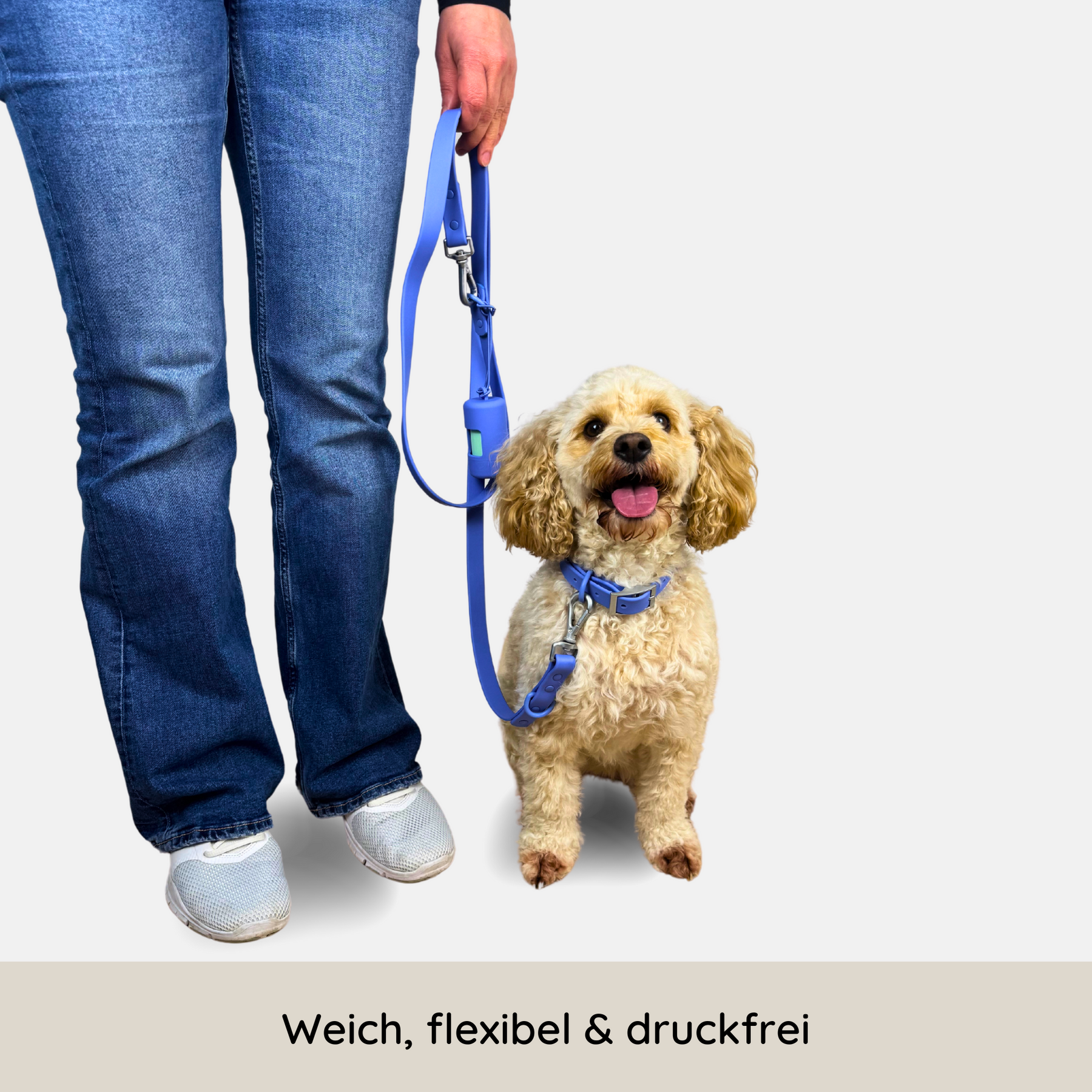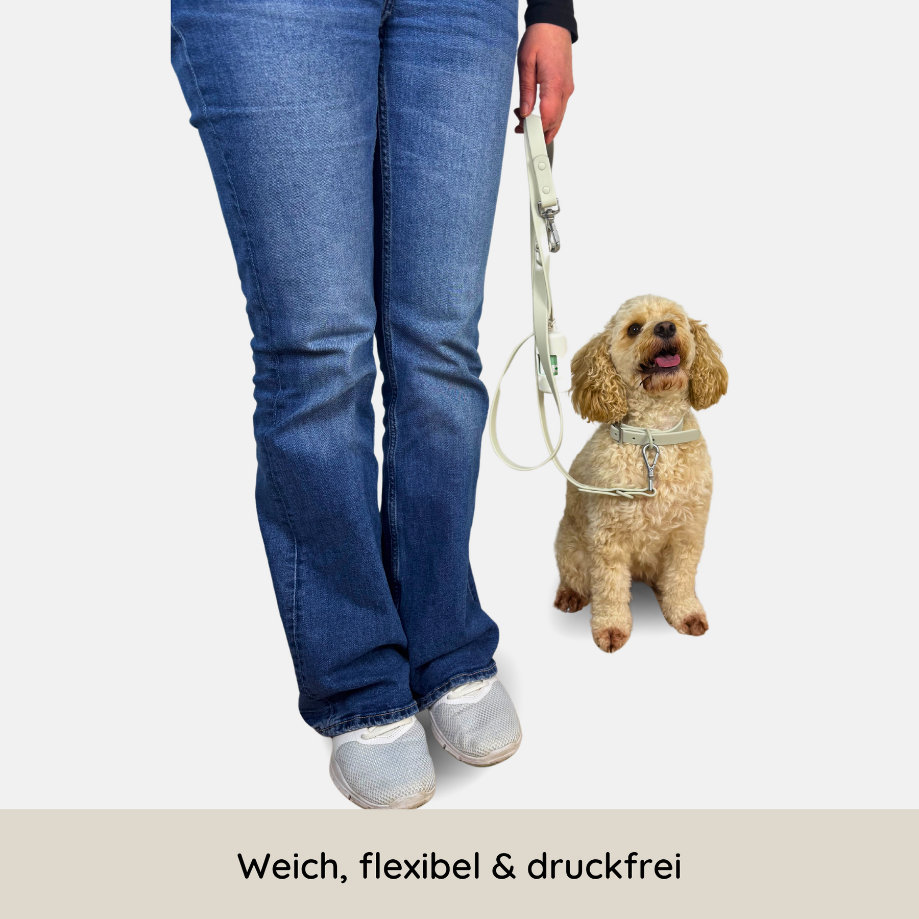 Das weiche, flexible Material mit abgerundeten Kanten liegt angenehm am Hals und verhindert Scheuern und Druckstellen, während das verstellbare Design eine perfekte Passform und Flexibilität bietet. So bleibt das Halsband auch bei wachsenden Hunden stets bequem und sicher.
