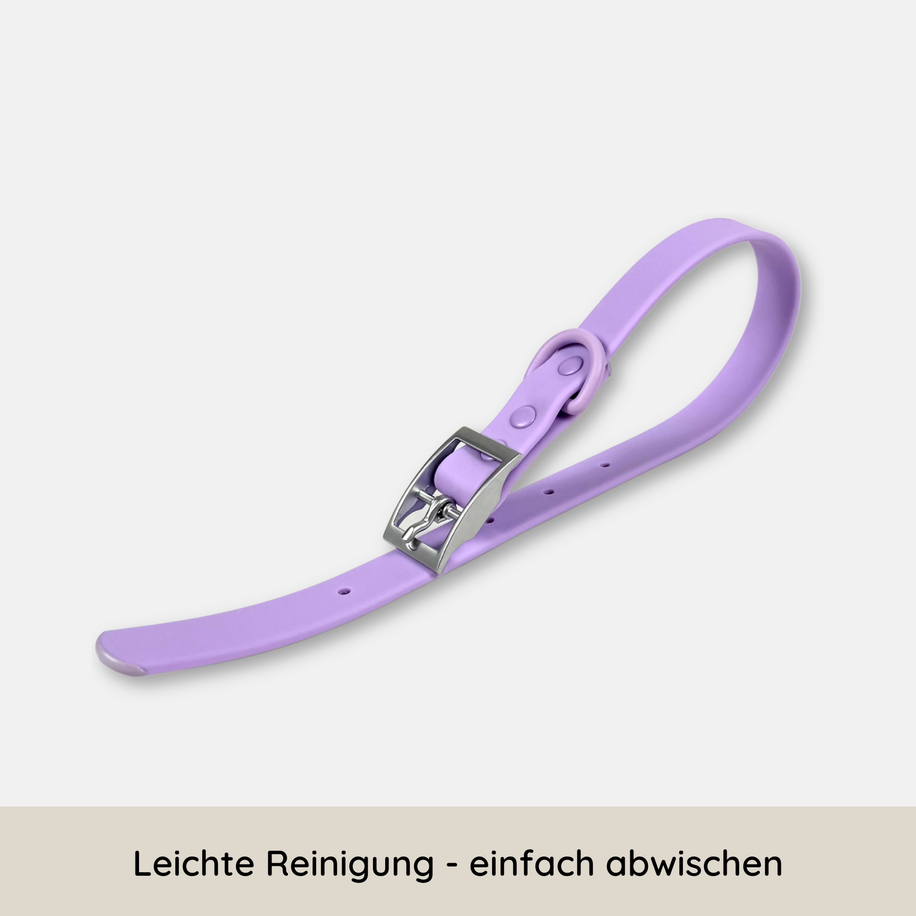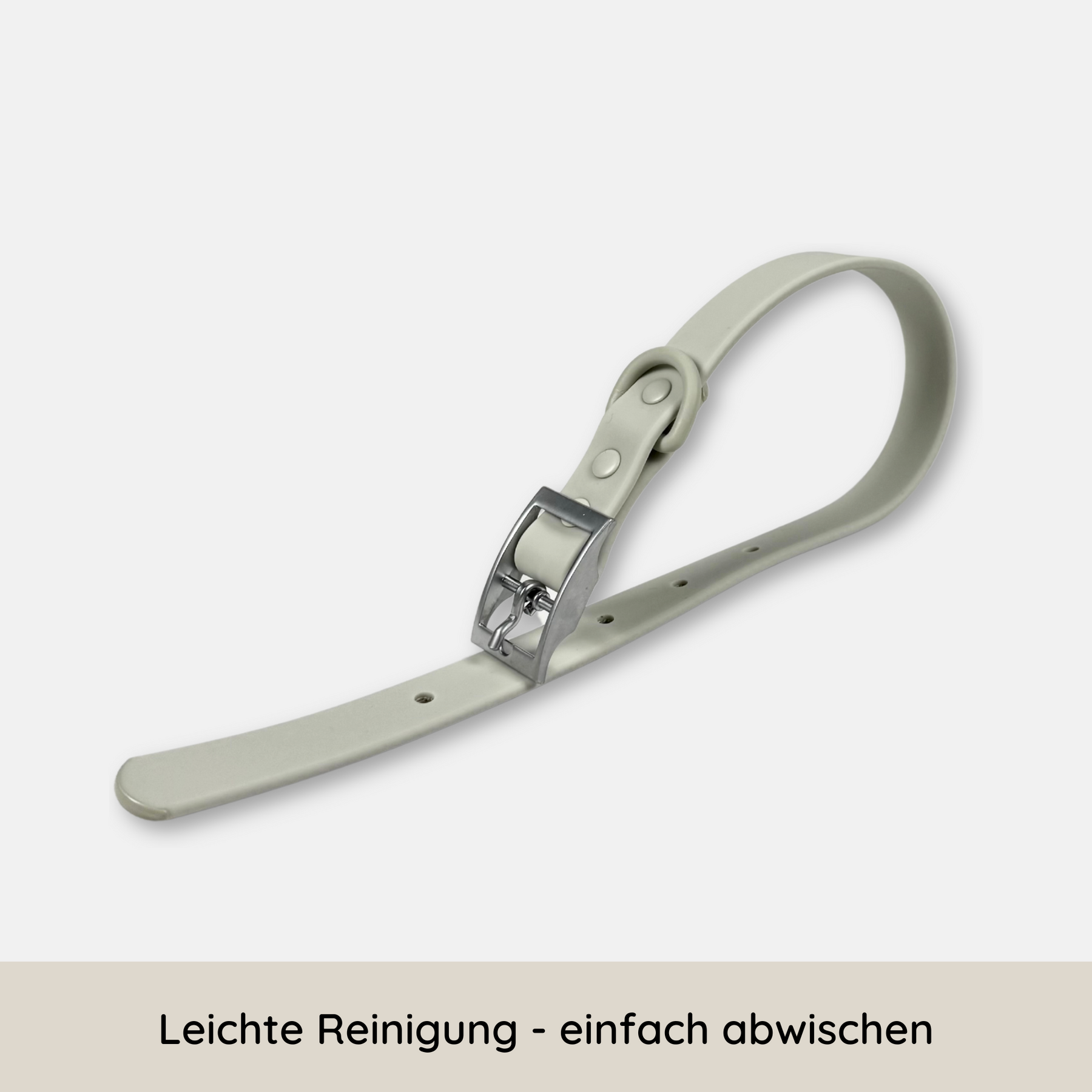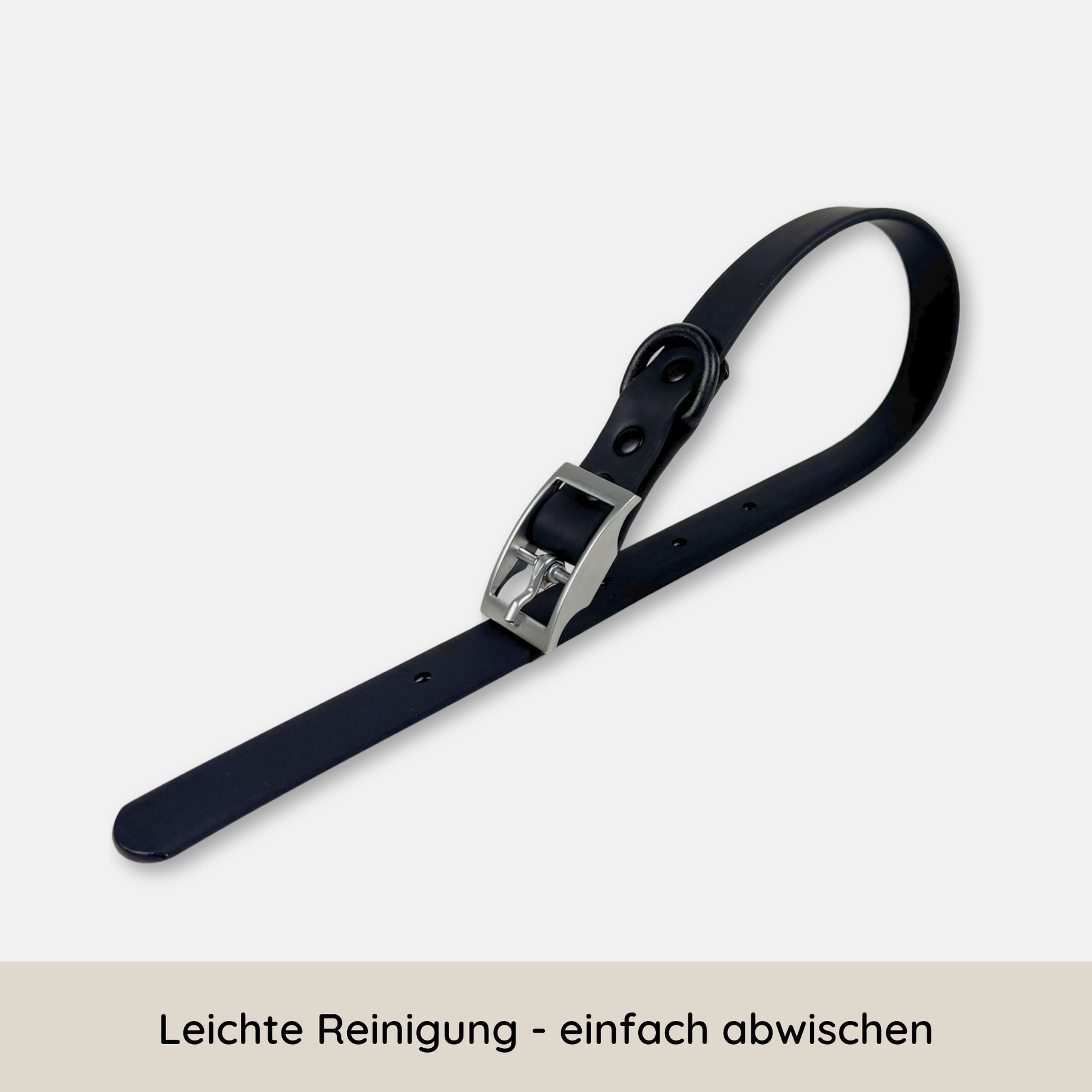 Das Hundehalsband Pura vereint Stil, Komfort und Strapazierfähigkeit. Dank der PVC-Beschichtung ist es wasserabweisend, geruchsneutral und besonders leicht zu reinigen. Die robuste Schnalle aus Zinklegierung und der stabile D-Ring aus beschichtetem Carbonstahl sorgen für zuverlässige Sicherheit bei jedem Spaziergang.